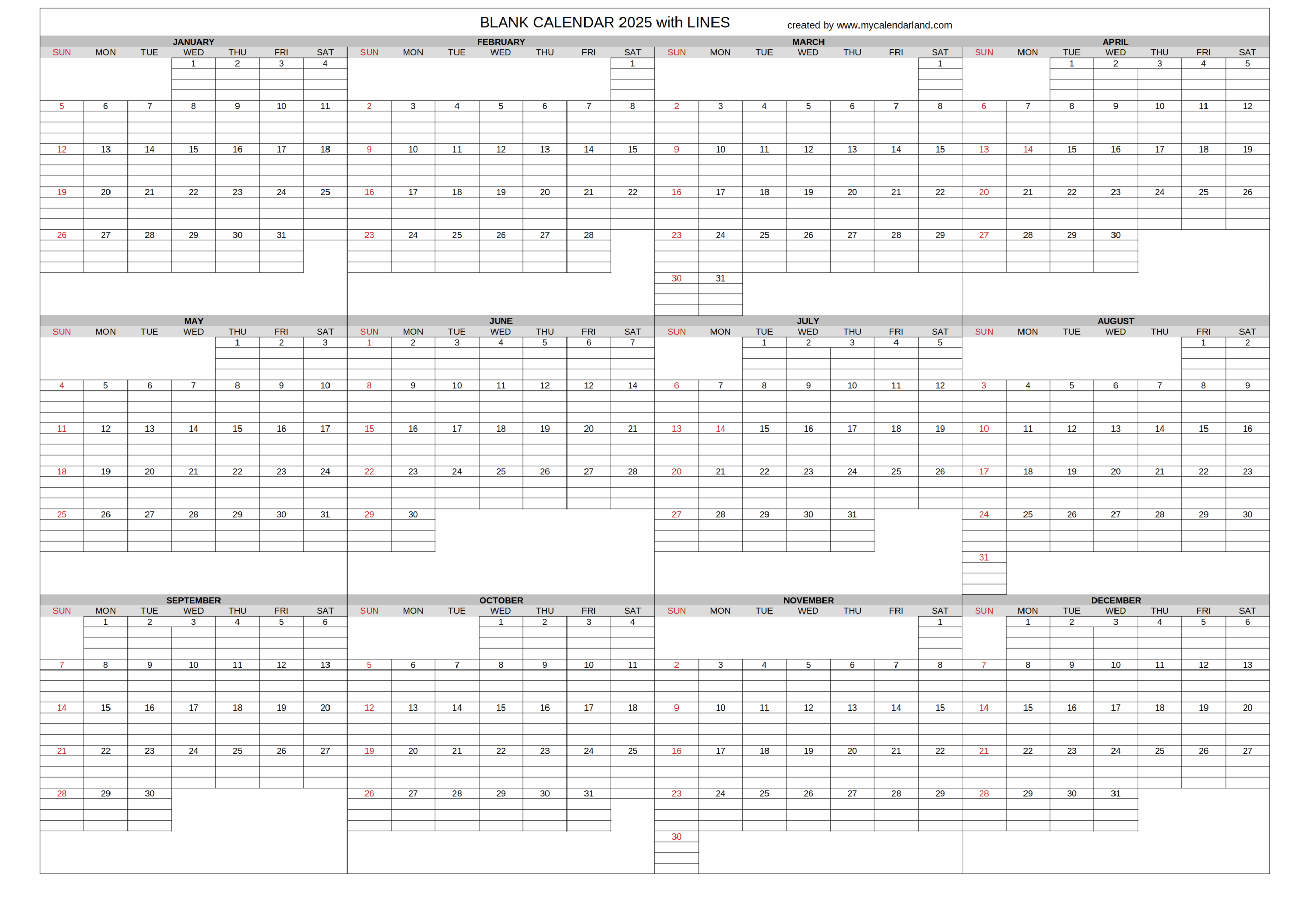 With a blank printable calendar 2025 with lines, you have the flexibility to customize it to your liking. You can easily add important dates, deadlines, appointments, and more, all in one convenient place. Plus, the lines make it easy to keep your writing straight and organized.