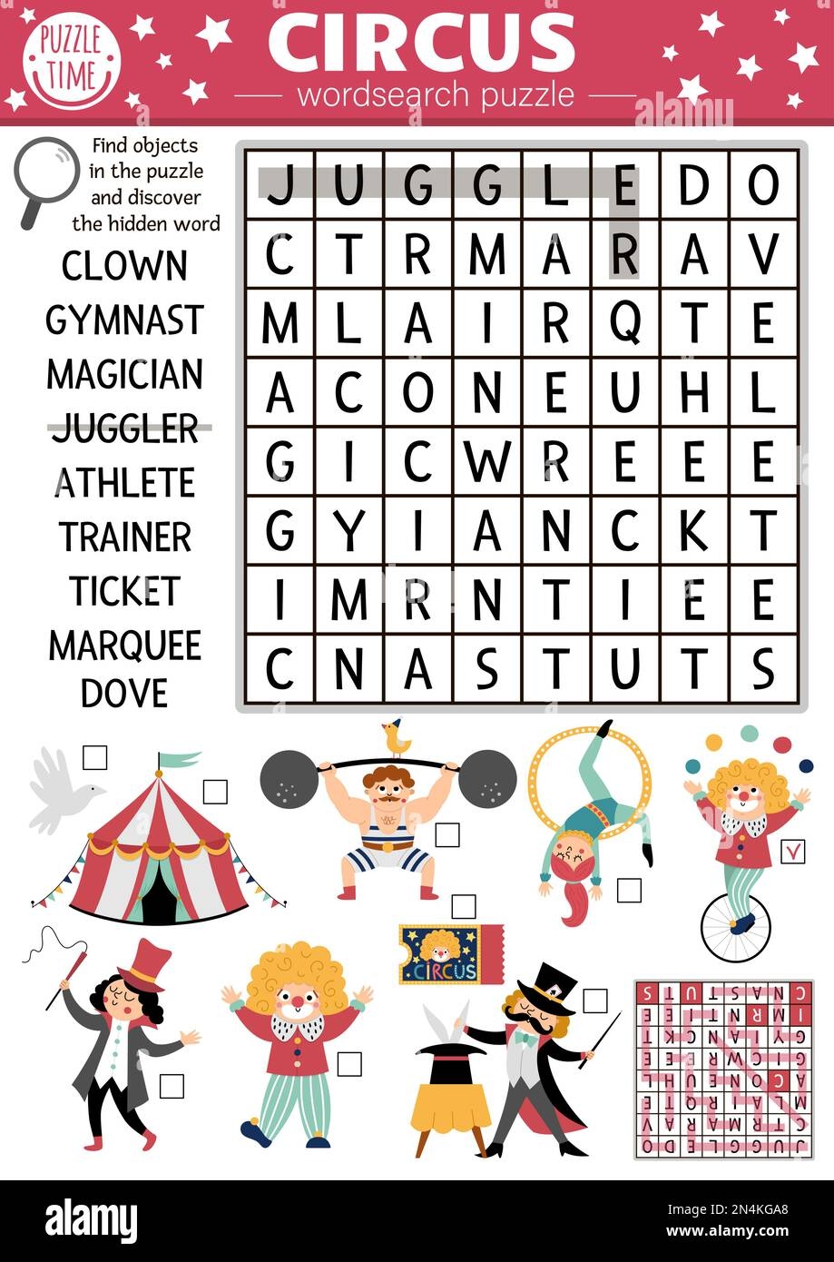 Vector Circus Wordsearch Puzzle For Kids Simple Amusement Crossword With Funny Performers For Children Activity With Clown Marquee Magician Athle Stock Vector Image Art Alamy