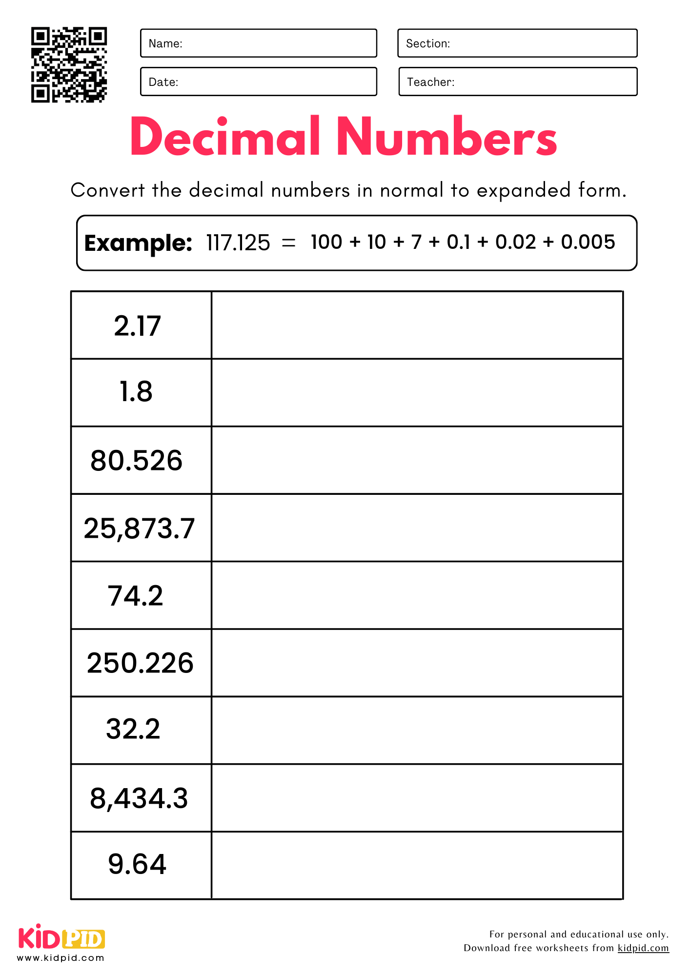 Convert Decimal Numbers Normal To Expanded Form Place Value Worksheet For Grade 5 Kidpid