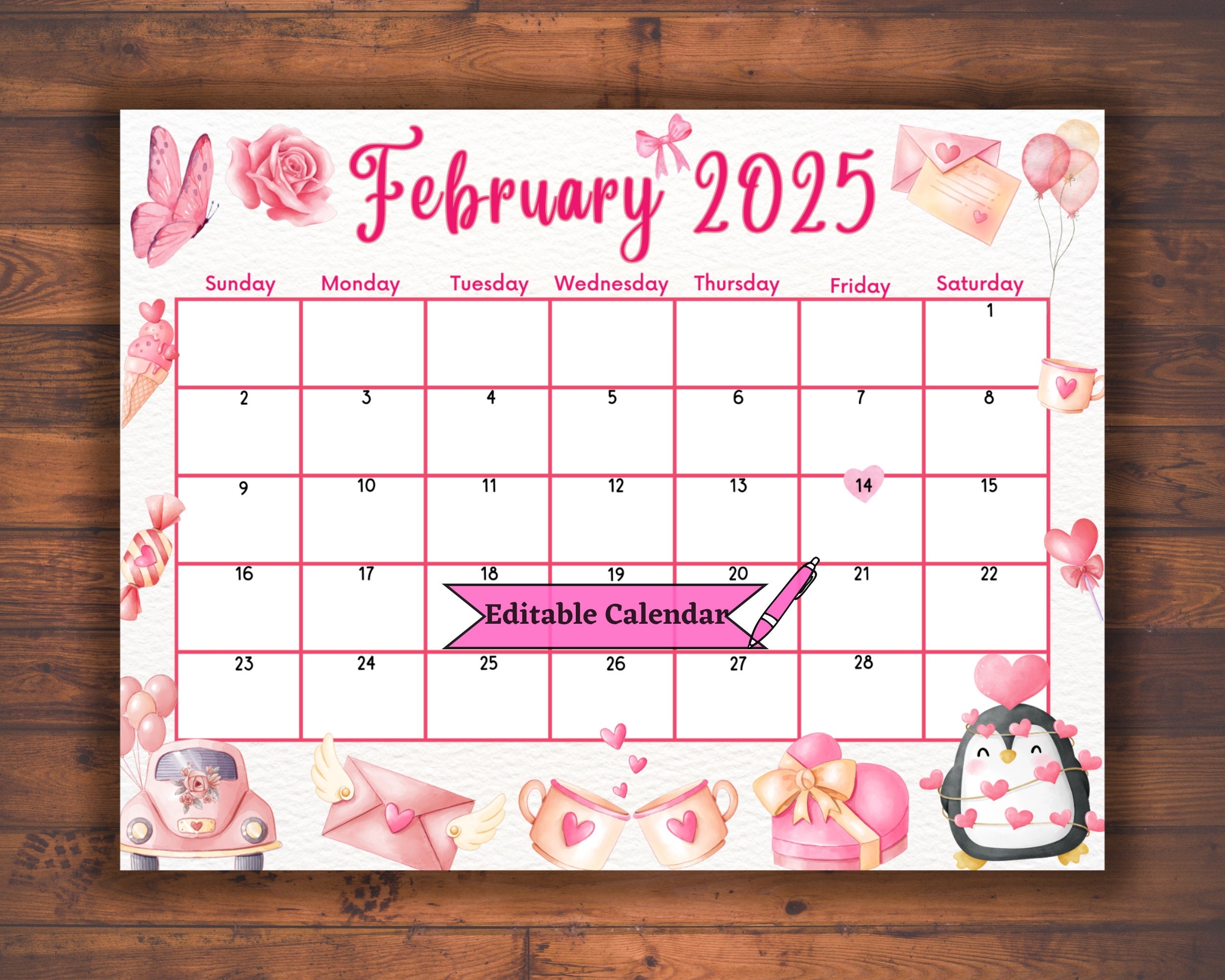 Editable Fillable February 2025 Calendar For Valentine s Day Digital Printable Winter Planner Cute Design Lovely Gifts For Kids Family Etsy