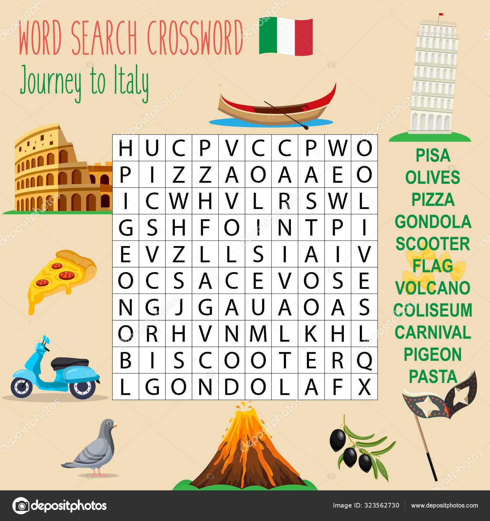 Easy Word Search Crossword Puzzle Journey To Italy For Children In Elementary And Middle School Fun Way To Practice Language Comprehension And Expand Vocabulary Includes Answers Vector Illustration Royalty Free SVG Cliparts