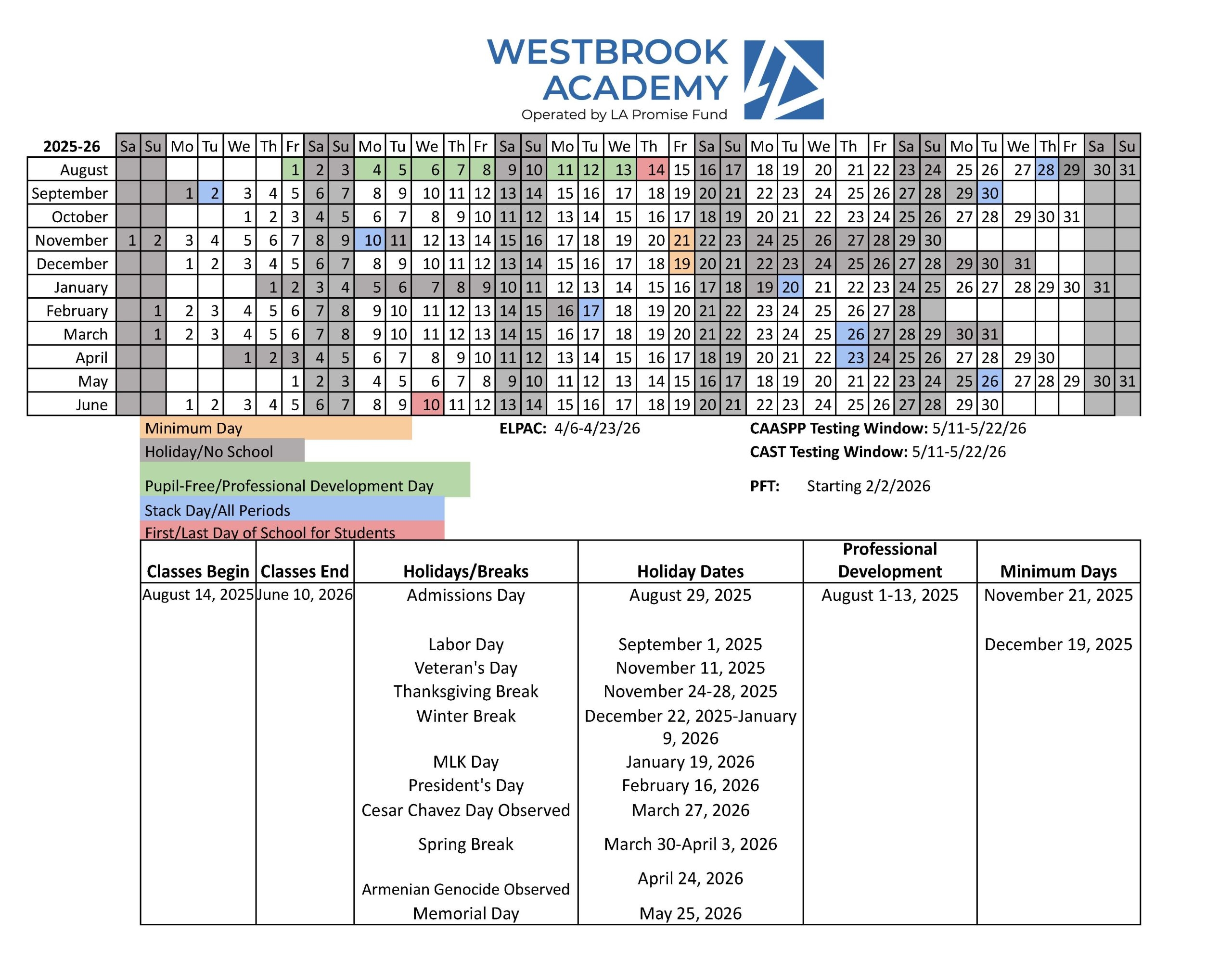 Academic Calendar WestBrook Academy