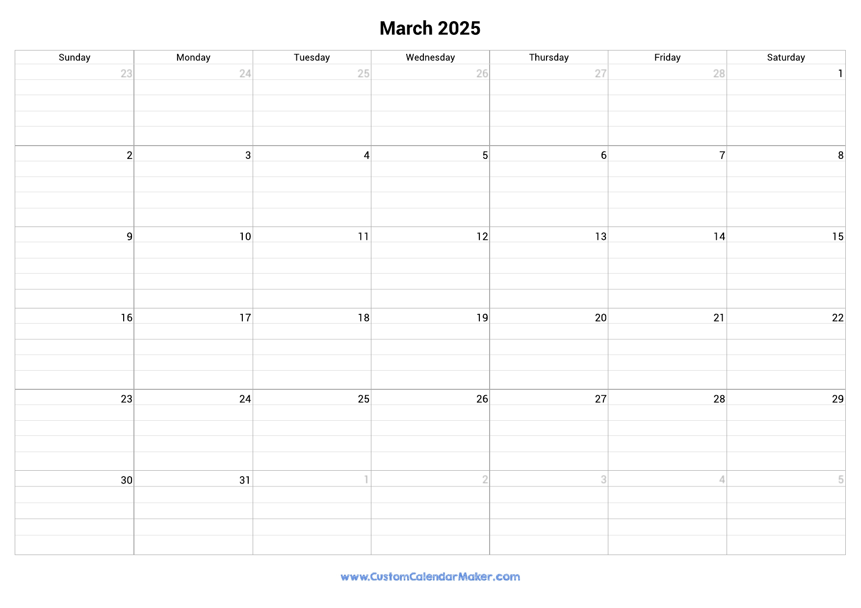 March 2025 Fillable Calendar Grid With Lines Custom Calendar Maker