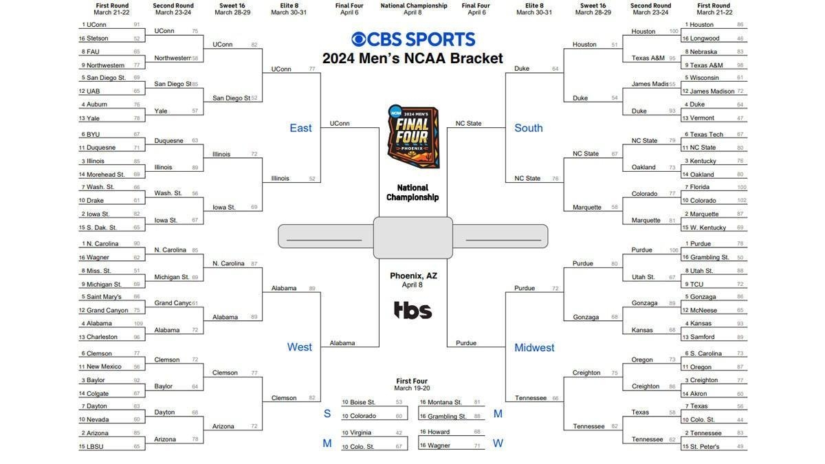 NCAA Tournament 2024 Printable March Madness Bracket Predictions Picks Scores For Final Four CBSSports