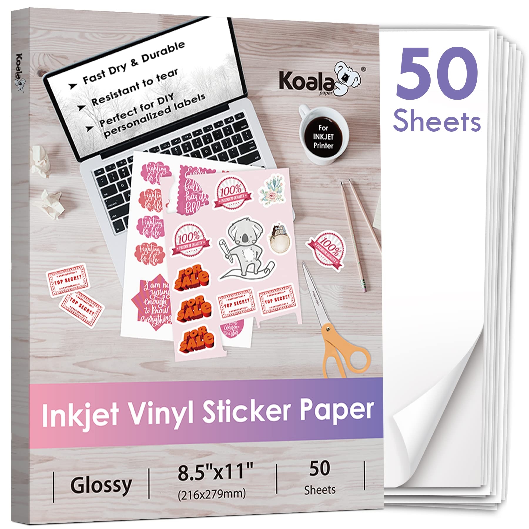 Amazon Koala Printable Vinyl Sticker Paper For Inkjet Printer 50 Sheets White Glossy Sticker Paper Waterproof Sticker Printer Paper 8 5×11 Inch Tear Resistant Removable Office Products