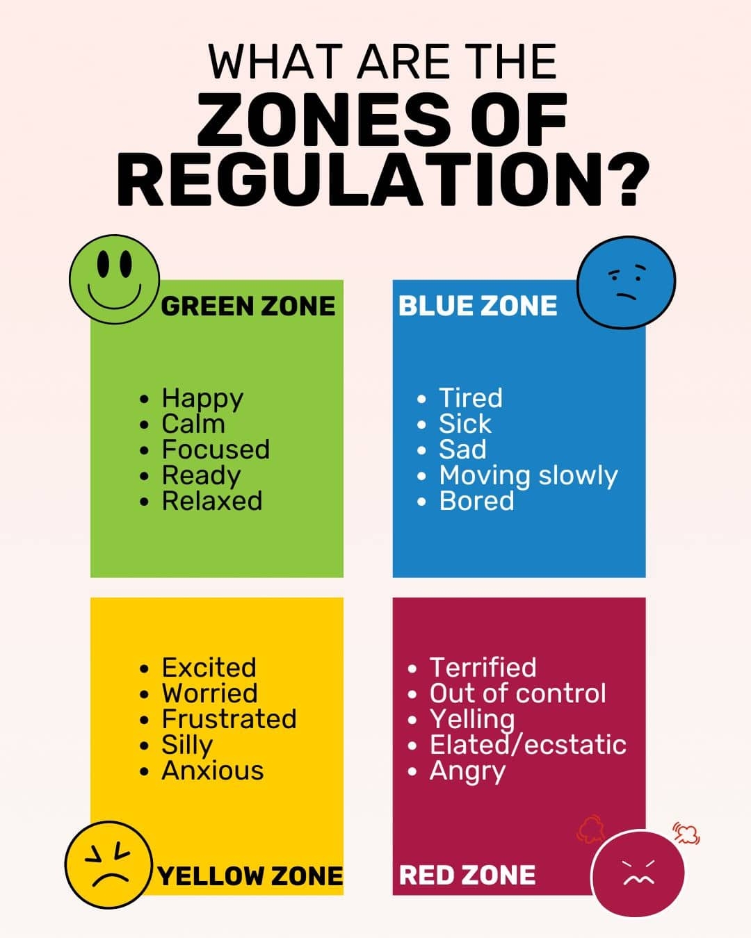 By using color-coded zones – blue, green, yellow, and red – individuals can easily recognize how they are feeling at any given moment. The chart also provides strategies and tools to help regulate emotions and move from one zone to another in a healthy way.